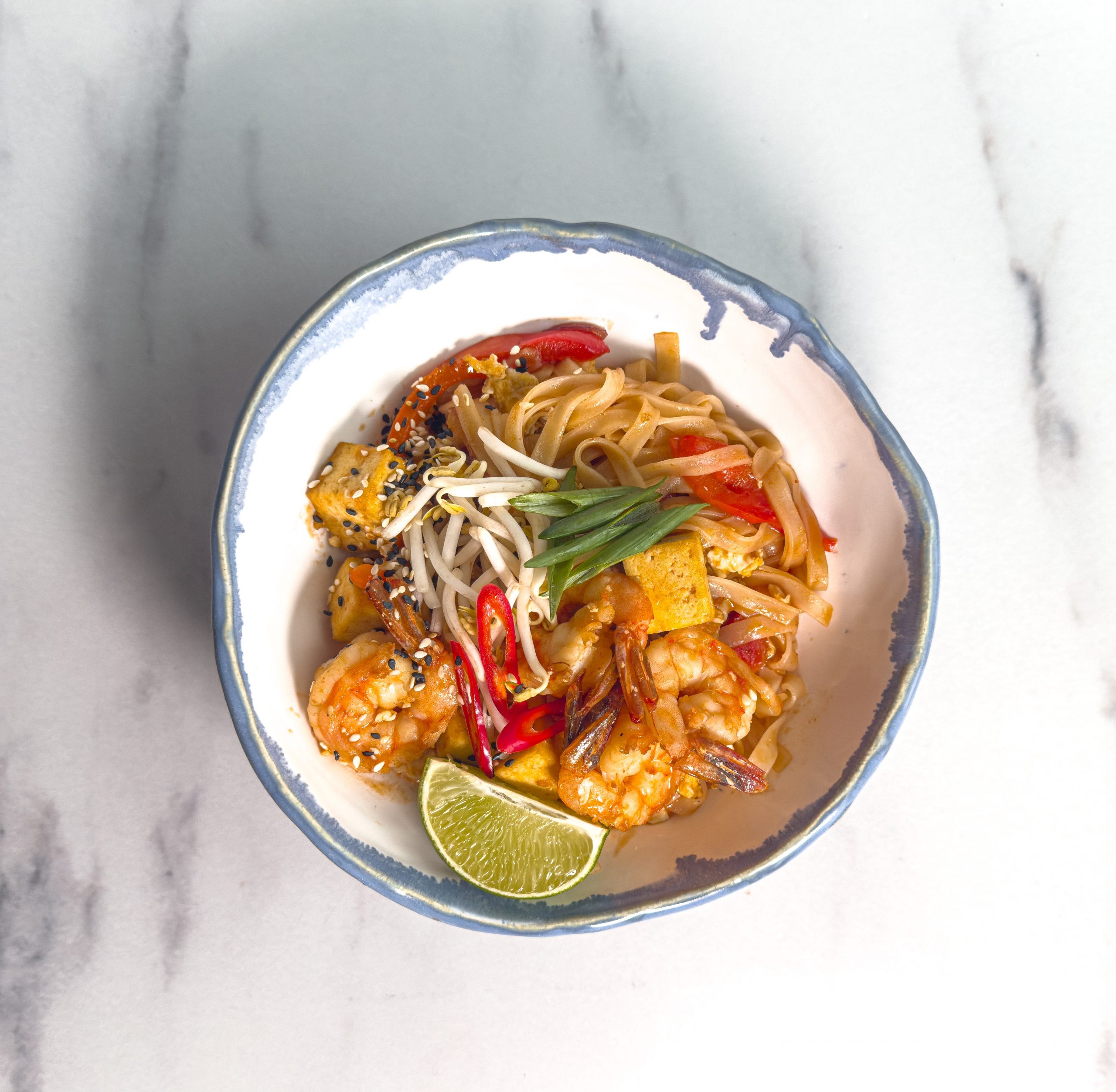 Лапша харусаме, креветка, тофу, яйцо, перец болгарский, лук красный, ростки сои
