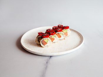 Рис, нори, сыр творожный, лосось копченый, авокадо, томаты, стружка тунца, соус терияки