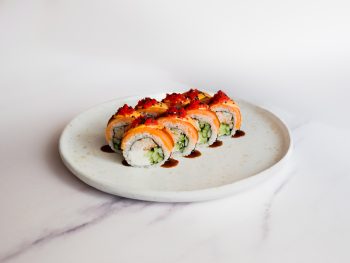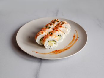 Рис, сыр творожный, огурец свежий, угорь, лосось копченый, креветка, соус спайси, соус терияки, икра тобико
