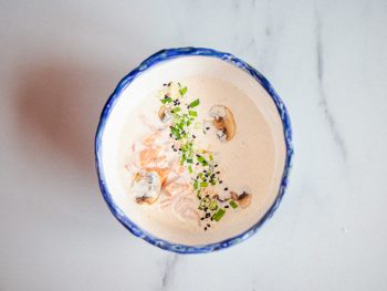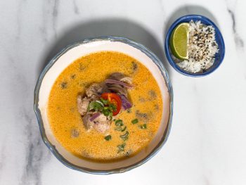 Бульон Том Кха, мякоть бедра цыпленка, вешенки, шампиньоны, лук красный, черри, лук зеленый / рис, лайм 340г / 55 г