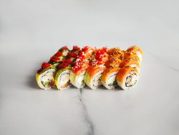 – Ролл с сурими, лососем и авокадо – Ролл с такуаном и пирой – Ролл с лососем, шиитаке и сыром чеддер Имбирь, васаби, соевый соус