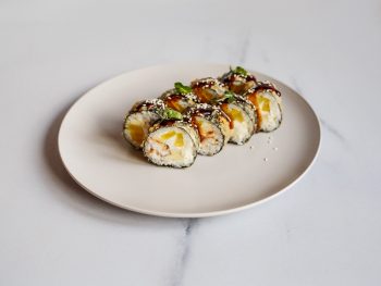 Рис, сыр творожный, огурец свежий, угорь, лосось копченый, креветка, соус спайси, соус терияки, икра тобико