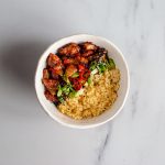 Мякоть бедра цыпленка в глазури Хойсин, ананас, перец болгарский, рис карри, лук зеленый, перец чили