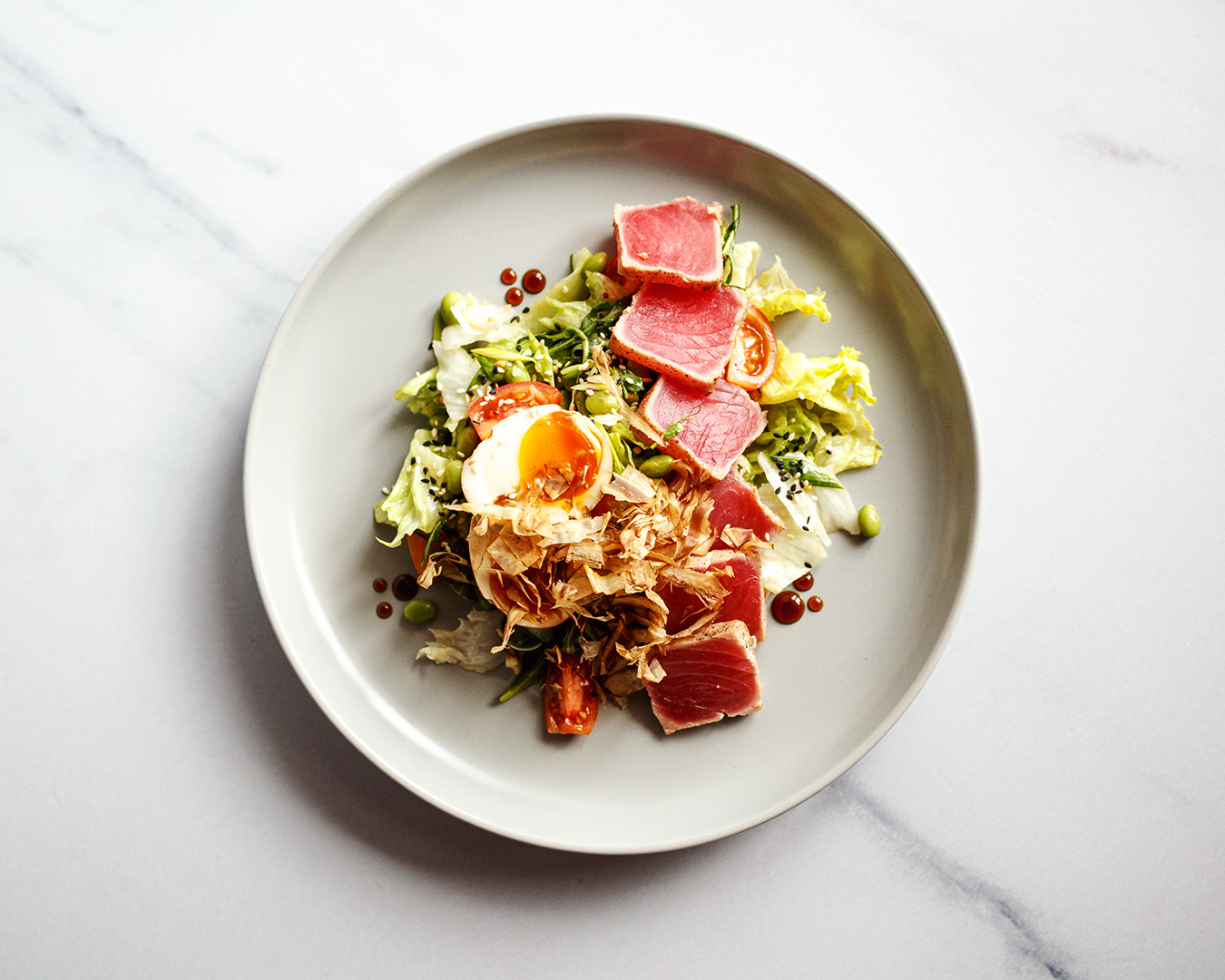 Тунец татаки, салат айсберг, рукола, черри, огурец, бобы эдамаме, стружка тунца, маринованное яйцо, заправка нисуаз