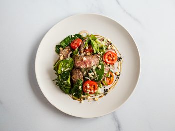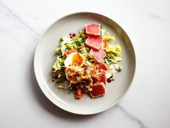 Тунец татаки, салат айсберг, рукола, черри, огурец, бобы эдамаме, стружка тунца, маринованное яйцо, заправка нисуаз