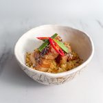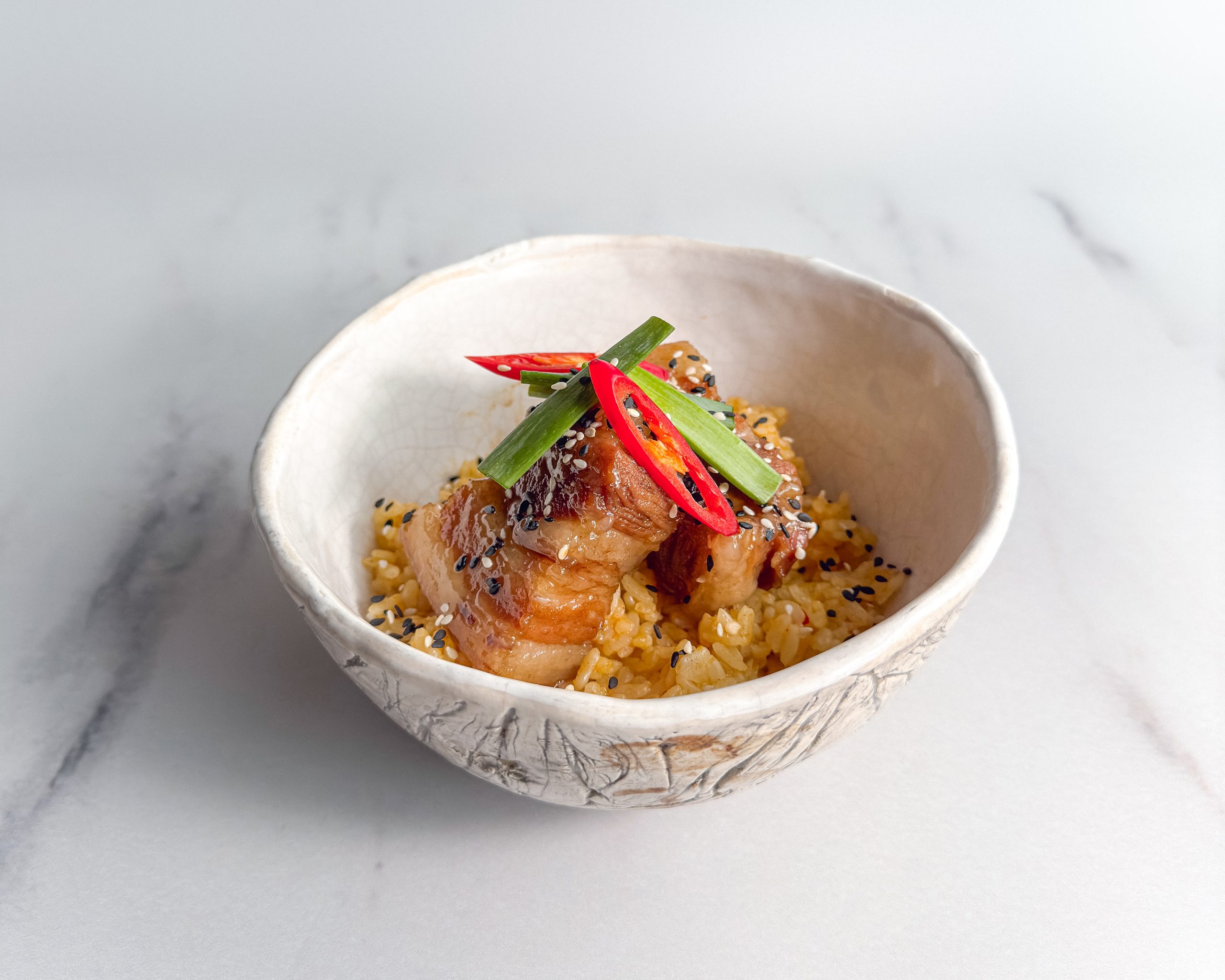 Грудинка свинина, рис, карри, перец чили, лук зеленый, кунжут