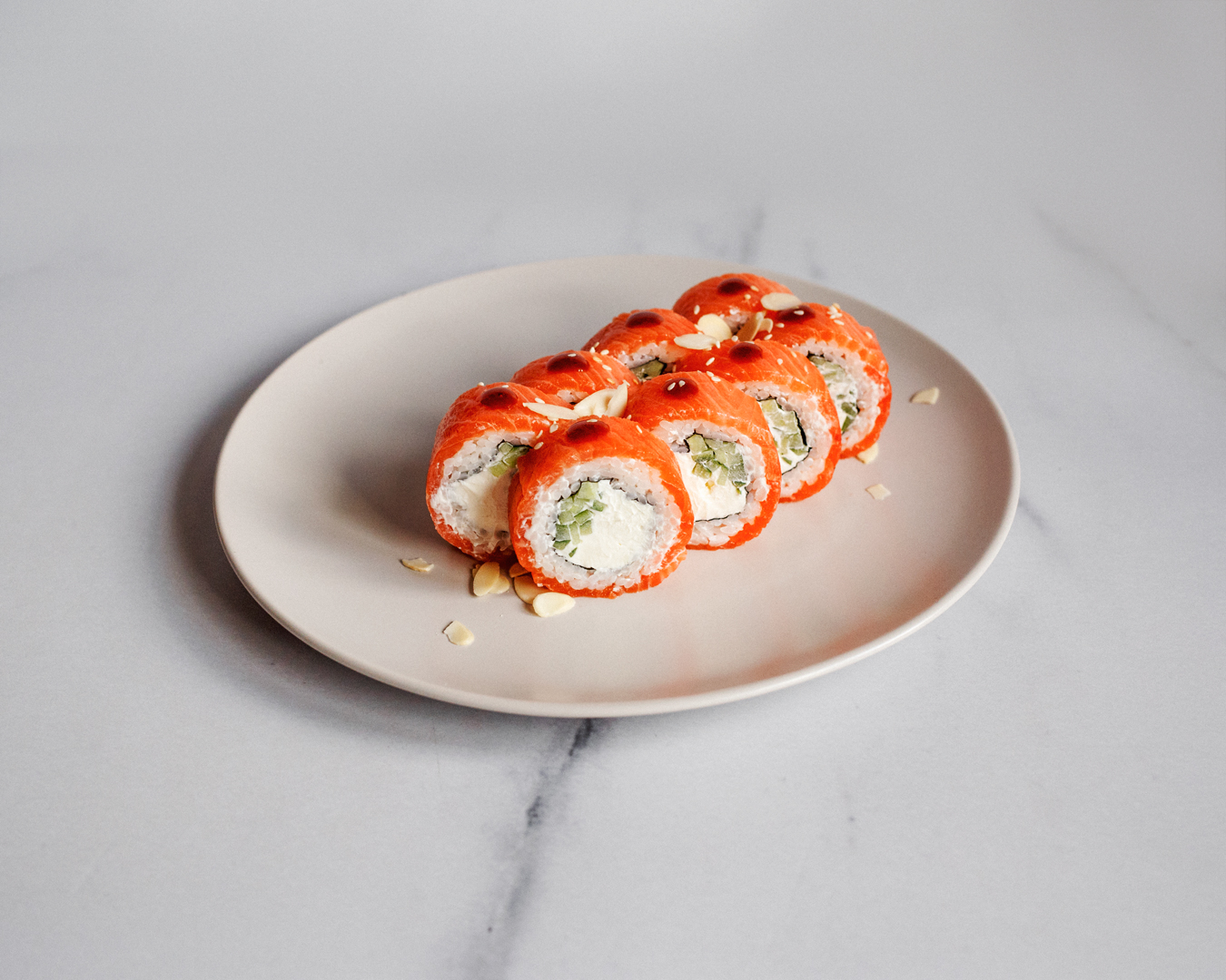 Рис, нори, сыр творожный, лосось слабосоленый, огурец свежий, миндаль, соус терияки