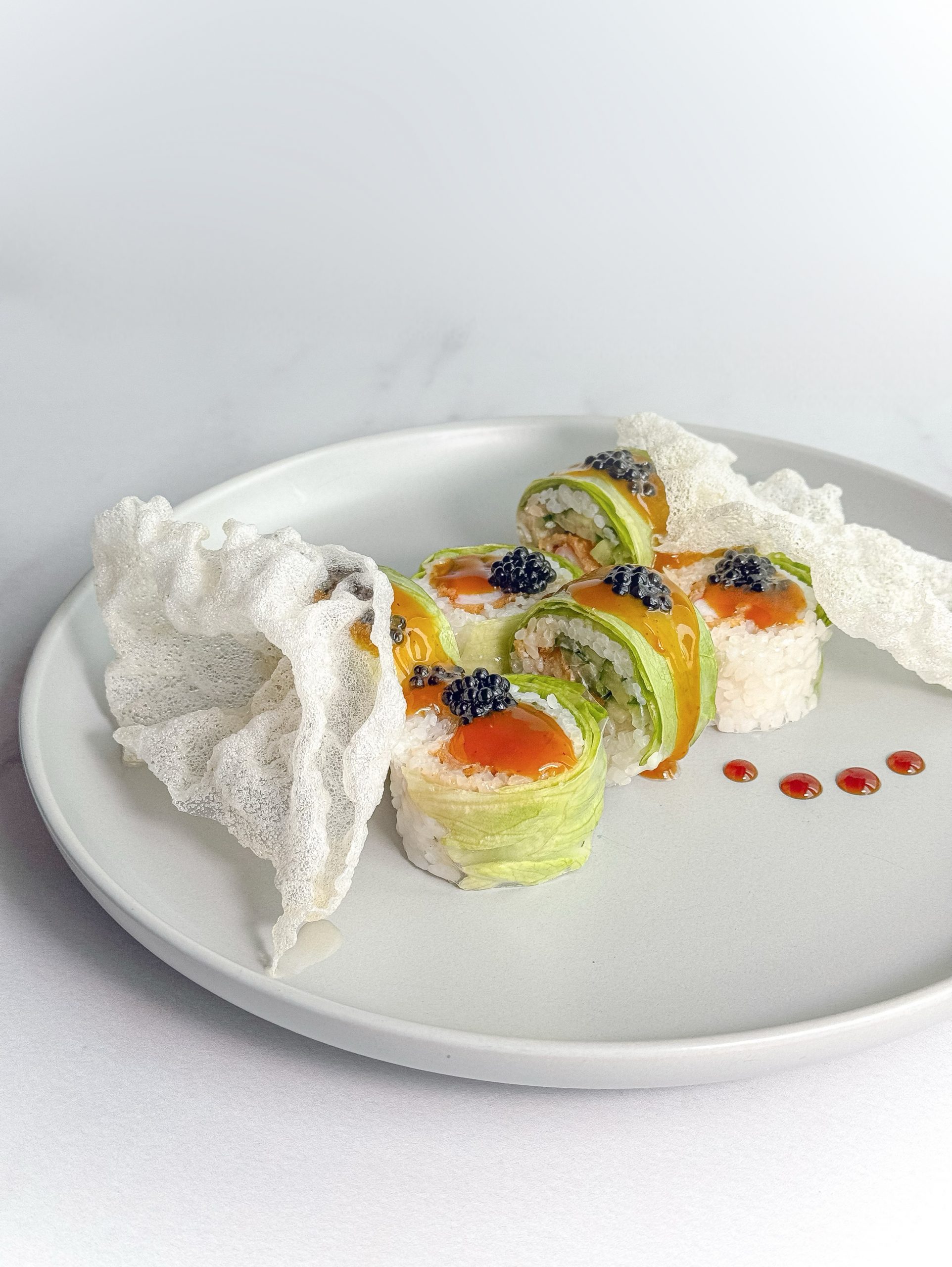 Рис, нори, креветка, икра тобико, салат айсберг, яблоко, соус спайси, соус сырный