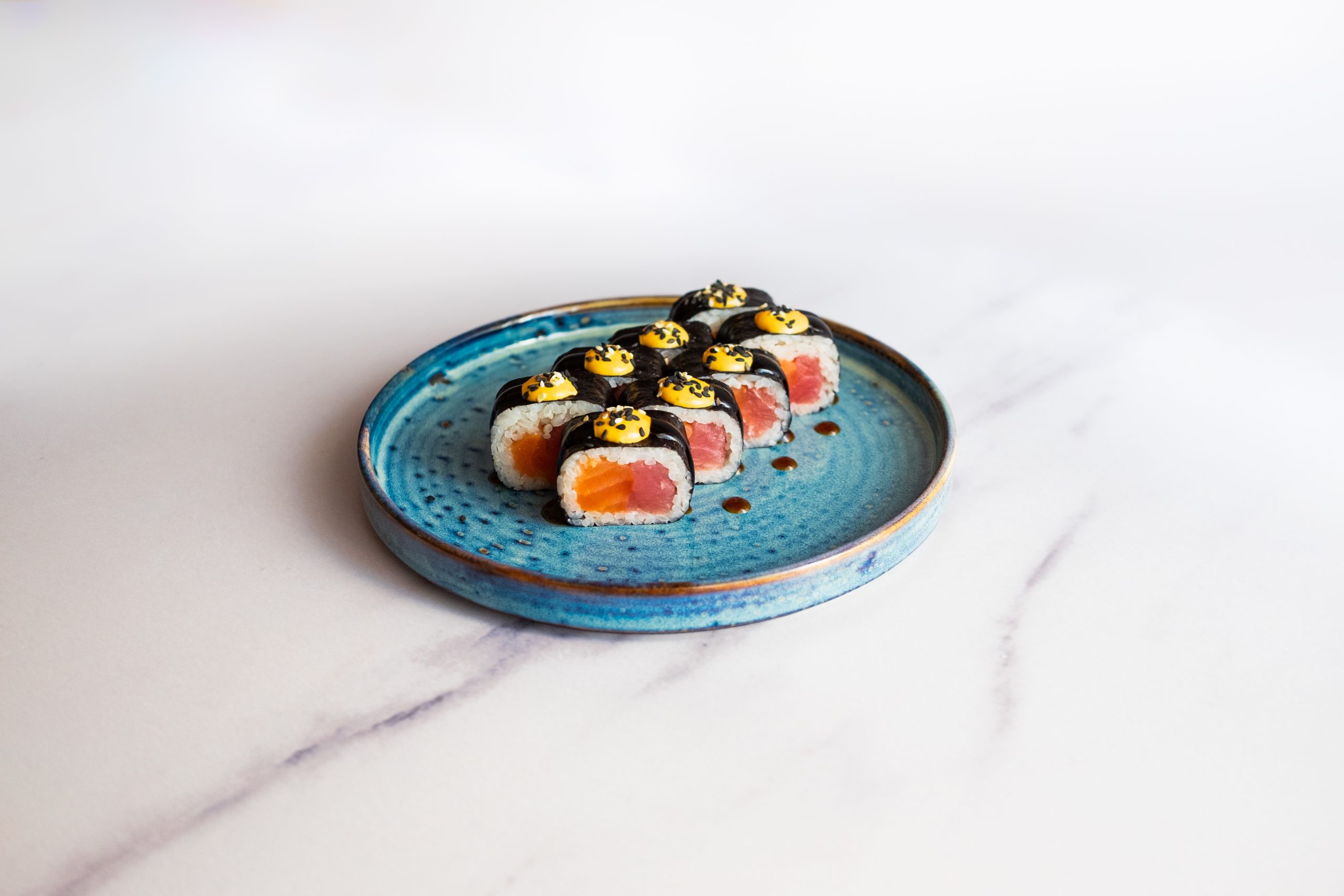Рис,тунец, лосось слабосоленый, соус терияки, соус спайси