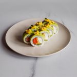 Рис, нори, сыр творожный, томаты, тигровая креветка, сурими, сыр чеддер, хрустящий лук, соус чили сладкий