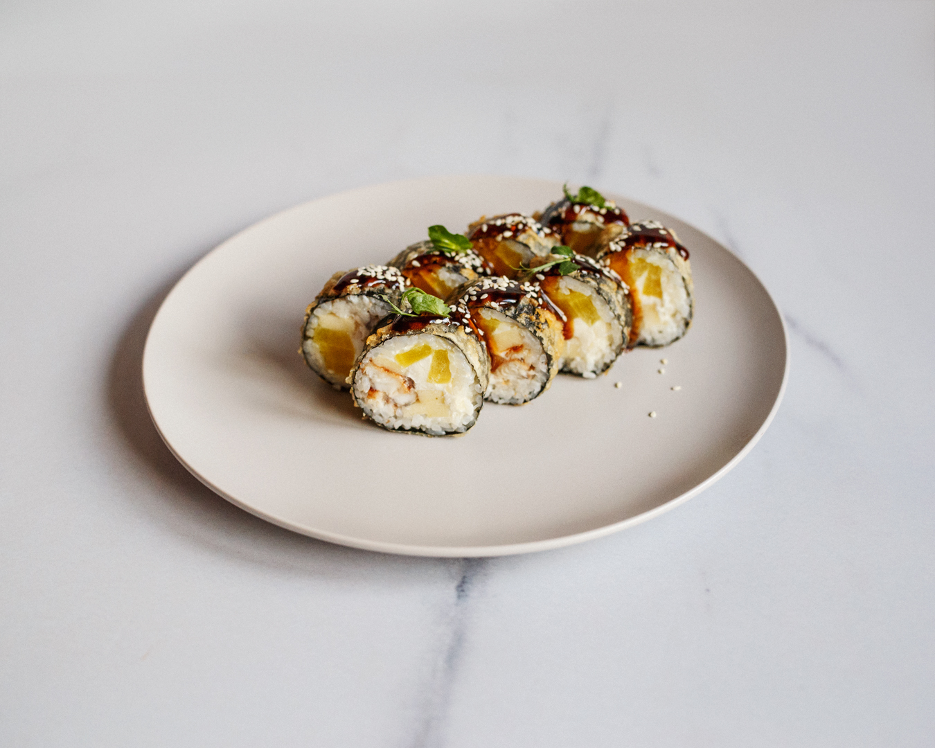 Рис, сыр творожный, огурец свежий, угорь, лосось копченый, креветка, соус спайси, соус терияки, икра тобико