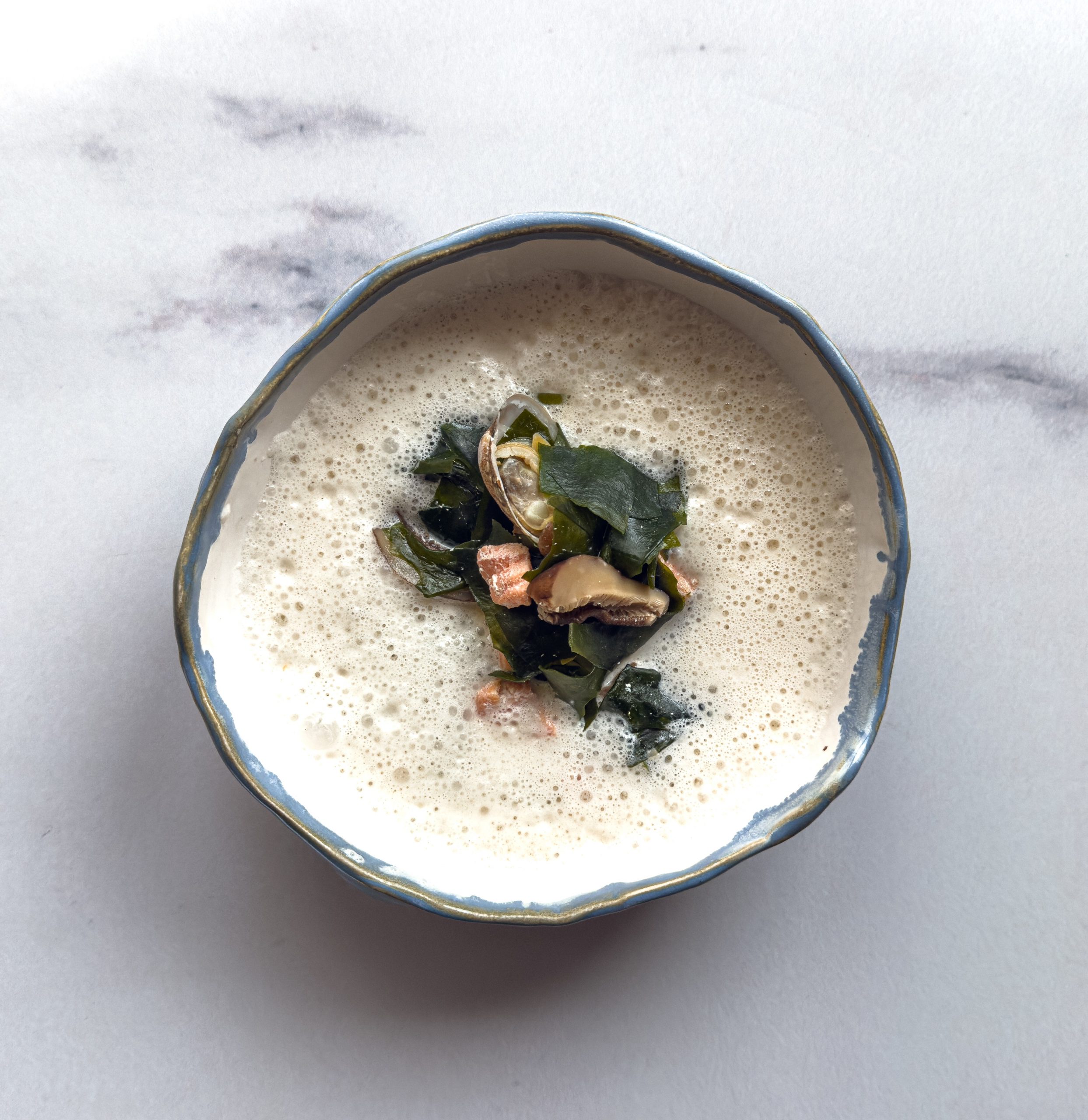 Бульон сливочный мисо, клеммы вонголе, лосось, шиитаке, водоросли вакаме