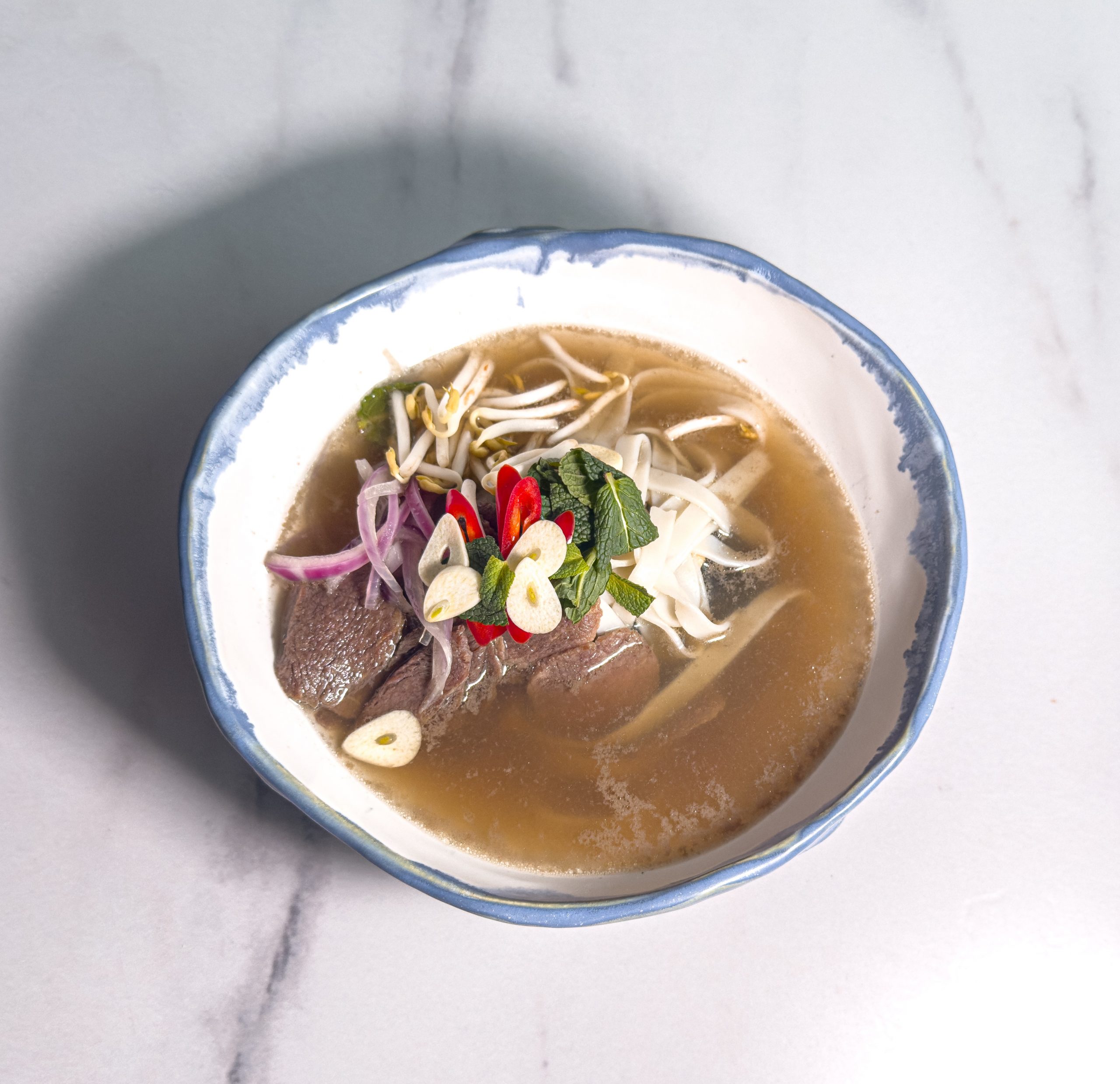 Бульон Фо Бо, говядина, лапша харусаме, лук красный, ростки сои, перец чили, чеснок, мята, лайм 370/15