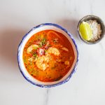 Бульон Том Ям, шампиньоны, шиитаке, креветка, кальмар, мидии, черри, лук зеленый / рис, лайм 370 / 55