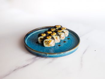 Рис, нори, сыр творожный, лосось копченый, авокадо, томаты, стружка тунца, соус терияки